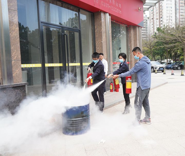 現(xiàn)場情景模擬疏散演練環(huán)節(jié),教官使用煙霧彈模擬會議室發(fā)生火災情景,現(xiàn)場工作人員組織參訓人員從五樓會議室按安全疏散通道指示撤離到一樓大門集中。在教官講解示范下,參訓人員進一步學習了干粉滅火器的使用方法和注意事項,參與了滅油桶火實操活動。